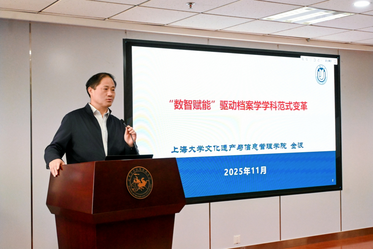上海大学文化遗产与信息管理学院教授金波作主旨报告《“数智赋能”驱动档案学学科范式变革》,系统阐述了数智时代档案学学科范式的深刻变革,指出档案管理对象正从传统档案向数字档案、档案数据质变,推动学科范式从“档案文件史料范式”“档案信息资源范式”向“档案数据智能范式”演进。新范式以数据科学和人工智能为核心,构建起涵盖价值观、问题域、方法论、理论树与共同体的完整路径结构,旨在通过双向赋能实现档案数据要素价值释放,推动档案事业向数字化、智能化、智慧化方向高质量发展。报告由南京大学信息管理学院教授吴建华主持。