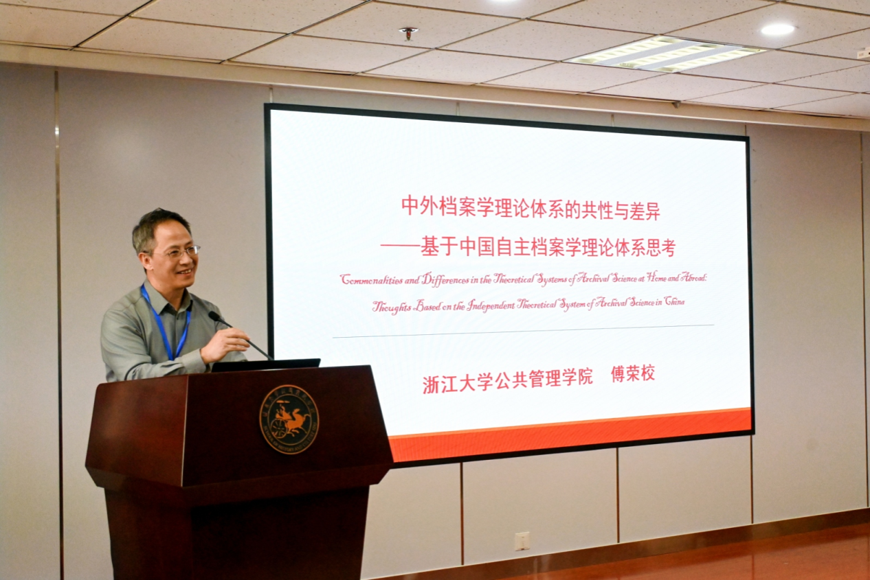 浙江大学公共管理学院教授傅荣校作主旨报告《中外档案学理论体系的共性与差异》,他指出,中外档案学理论体系在基础概念、档案规律认知、管理流程及数字转型等实践层面存在广泛共识;然而在价值导向与理论路径上存在根本差异——中国体系强调“党管档案”“为国守史”的政治属性与集体视角,理论构建具有实践驱动和政策引领特征;西方体系则侧重公共信托、个体权利与社会多元记忆,理论演进更多源于学术批判与范式推广。这一比较揭示出中外档案学理论体系各有其合理的自主性逻辑,中国档案学的自主建构应立足本土语境,同时保持开放对话。报告由湖南城市学院党委书记、教授何振主持。