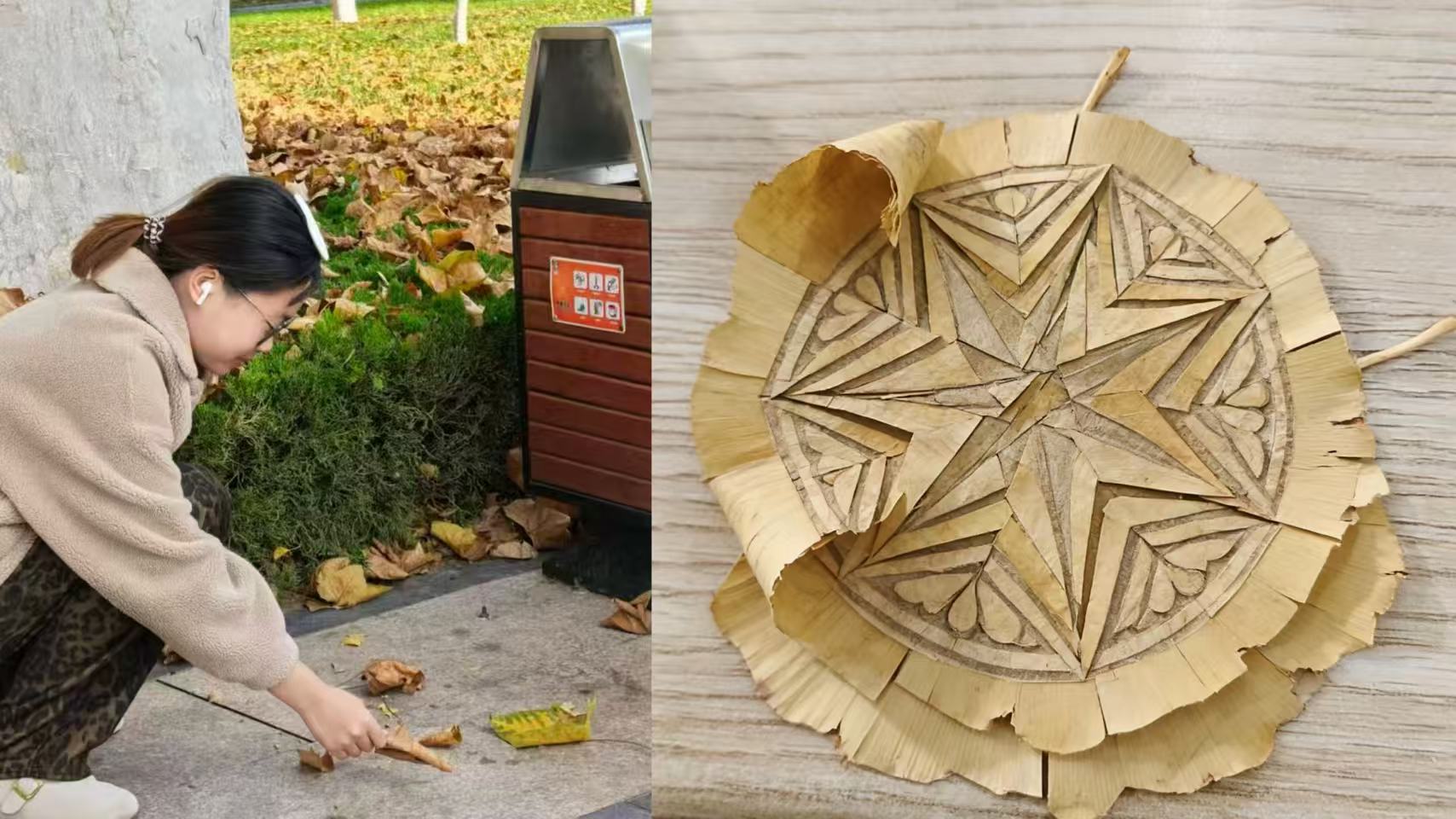 2024级文物全科人才2班团支部创新开展“秋日校园美颜行动”,不仅细致清扫成德大道的落叶,更结合专业特色,将收集的落叶作为创作素材,绘制青铜器兽面纹、玉器云雷纹等传统纹饰,实现“劳动+专业+文创”的深度融合,在美化校园的实践中诠释劳动创造与文化传承的当代价值。