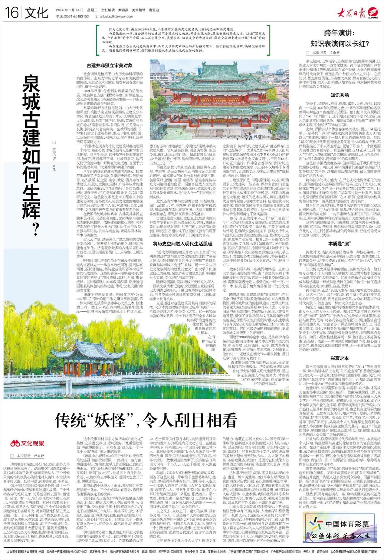 2026年1月14日《大众日报》刊登了《泉城古建如何生辉?》一文,详细介绍了历史学院师生开展的济南老城历史建筑的调查活动和相关成果。该项调查是2020级历史学专业与历史强基班本科生历时两年开展的,指导教师韩朝建、谭景玉等将学生们形成的7篇调查报告和19篇相关论文编辑成书,于近期正式出版并受到各界好评,为历史学院本科实践教学再添新成果。《大众日报》报道详细介绍了该项调查的基本情况和研究成果,指出济南是山东全省历史建筑活化“生辉”的前沿阵地,山大历史学科师生的持续深度调研,“唤醒沉睡的砖瓦”,“触摸到泉城古建融入现代生活的脉搏”。