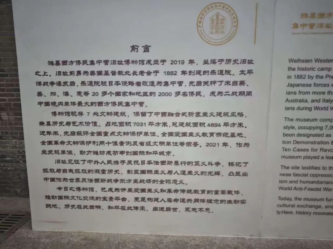 潍县西方侨民集中营旧址博物馆(以下称旧址)成立于2019年,而它的前身就是美国基督教北长老会于1882年创建的乐道院。1942年3月,日军强夺乐道院,将其改造成为专门用于关押在华外国侨民的潍县集中营,涉及世界范围内20多个国家,也从此开启了中外人民的温情互助之路。