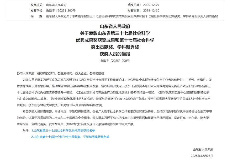 近日,山东省人民政府公布山东省第37届社会科学优秀成果奖获奖成果,历史学院9项科研成果获山东省第三十七届社会科学优秀成果奖,其中特等奖1项、二等奖2项、三等奖6项。成果名称成果分类期刊/出版社成果作者奖项孰为“中国”:中古三教“中国”论争与文化正统论文中国社会科学韩吉绍、张鲁君特等奖秦及汉初田租征收和计量问题新探论文历史研究代国玺二等奖中国古代村落文化研究著作商务印书馆马新二等奖如何认识中共的先进性?...
